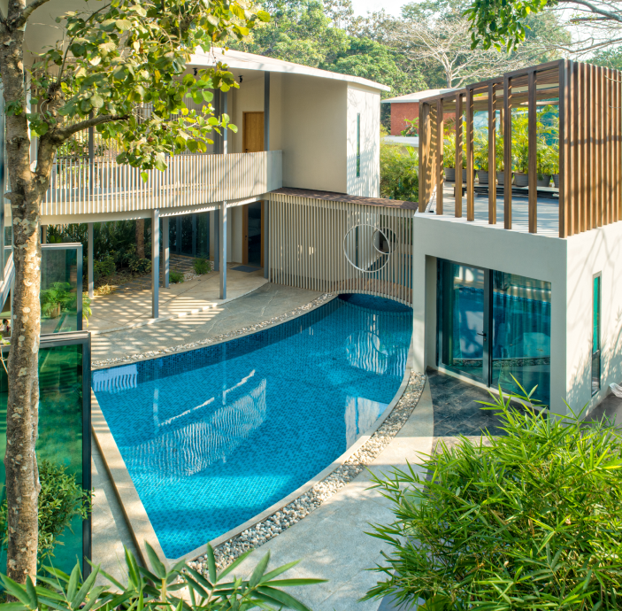 Beautiful crescent-shaped pool at the center of the house, surrounded by lush greenery